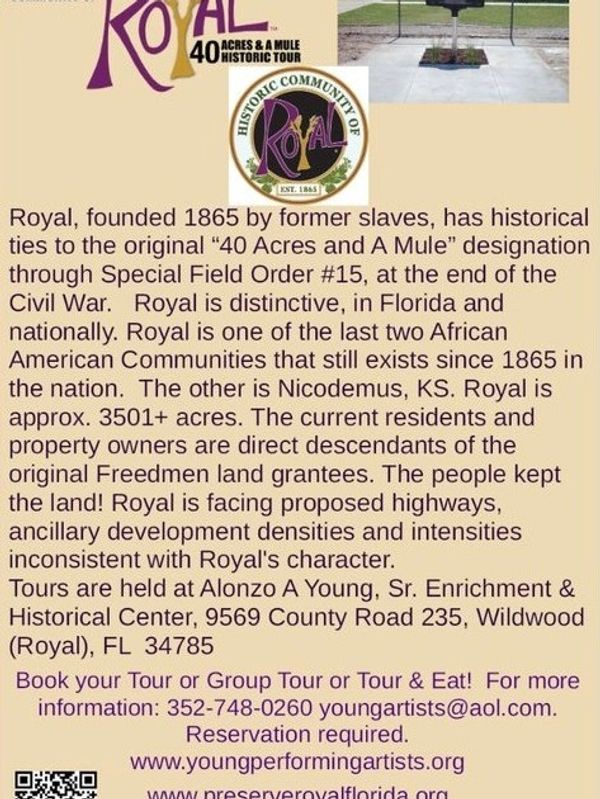 Royal is one of Florida’s oldest African American communities; 5 miles west of Wildwood. Our ‘40 Acres & A Mule Tour’ will ensure that one of Florida’s oldest African American Communities, founded by former slaves from the Old Green Plantation located near the Withlacoochee River, when slavery was abolished in 1865, is not engulfed, nor enslaved by present new development or its rich heritage vanished from the State of Florida historic landscape. One uniqueness is that Royal is made up of 40 Acres & 80 Acres parcels held from General Sherman’s 40 Acres & A Mule rule # 15.
